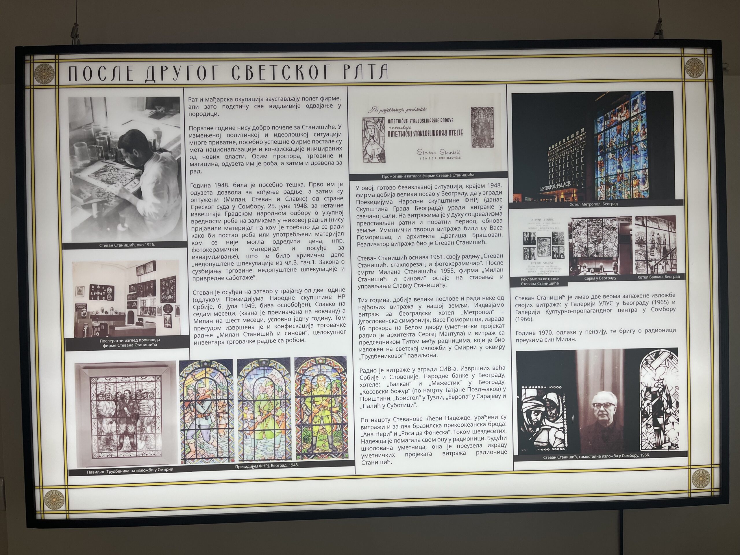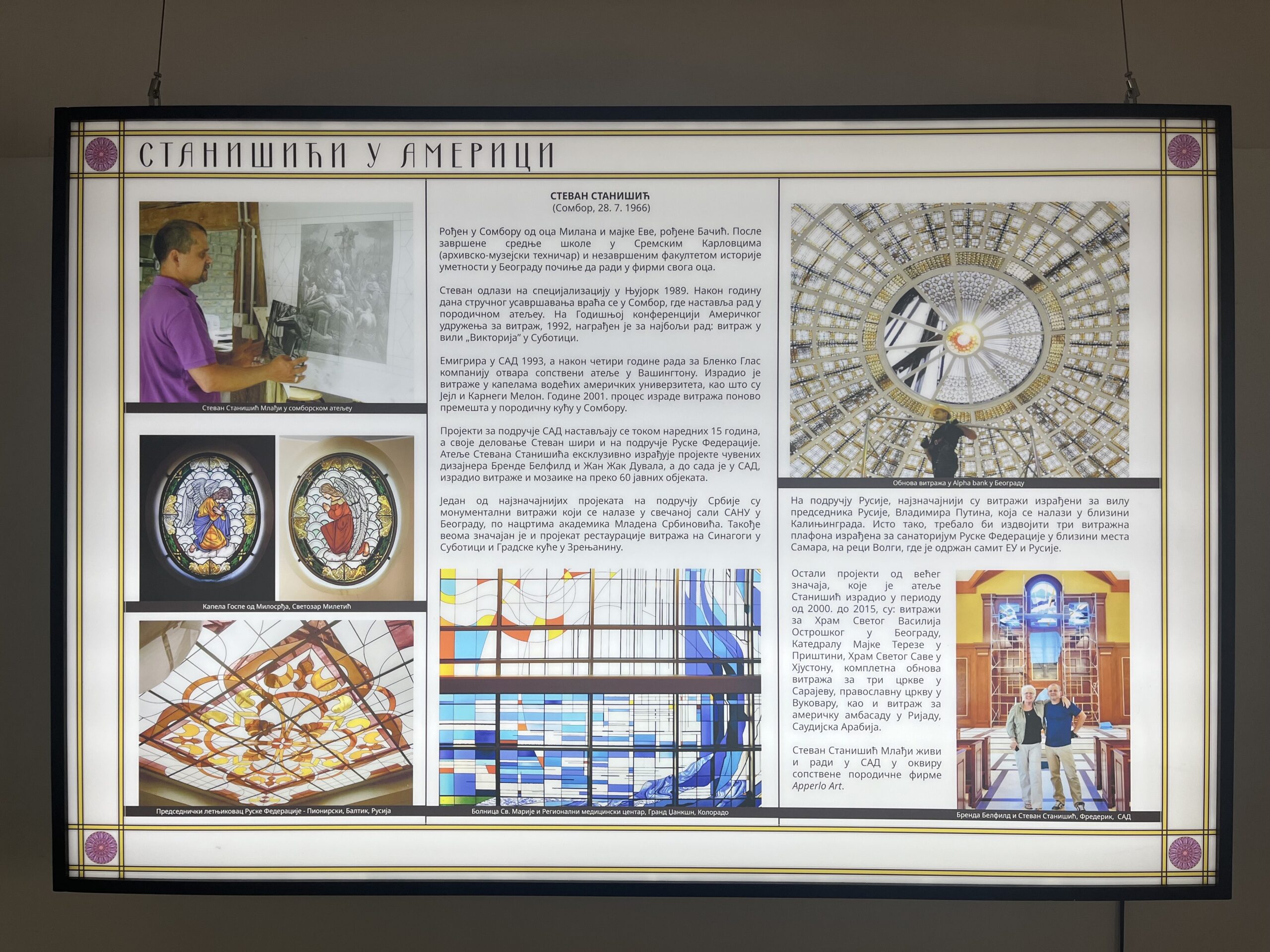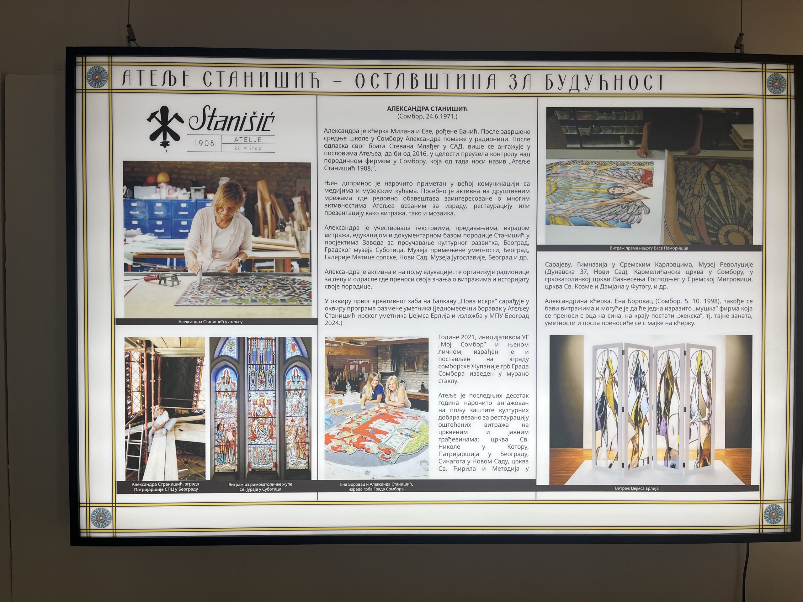 Autori izložbe uspeli su da sistematizuju sve Stanišiće koji su radili od 1898. godine, kada su se bavili prodajom ramova, čaša, porcelanskih i staklenih predmeta, pa do danas kada se neguje umetnost stvaranja vitraža.